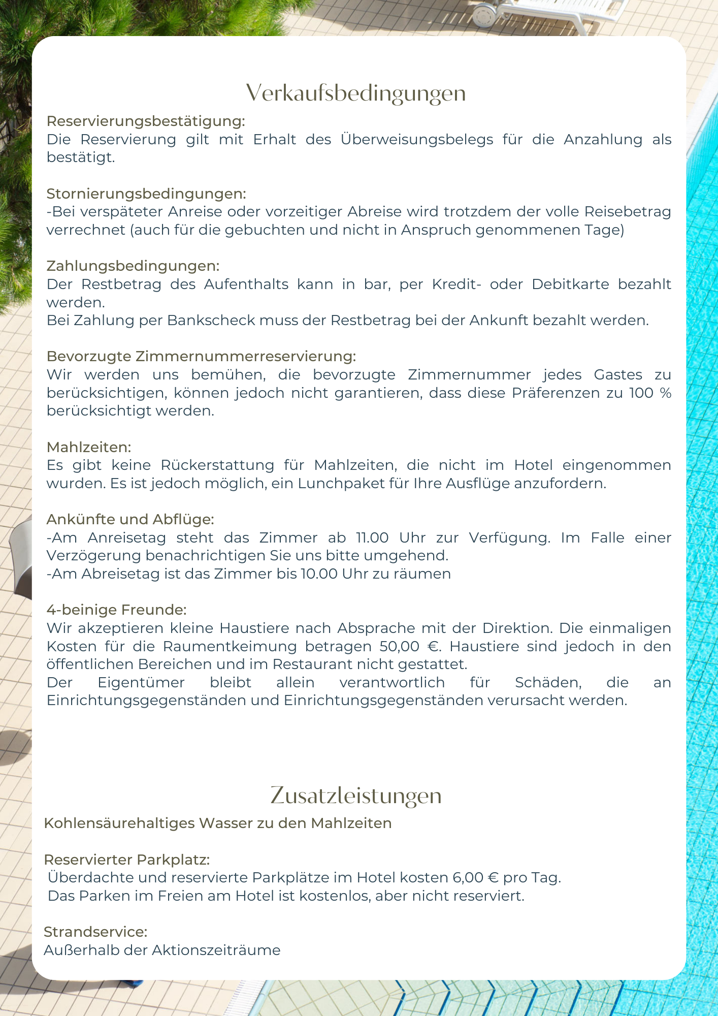 Die Preise verstehen sich pro Tag und Person, bei einem Aufenthalt min. 6 Nächte. Die Preise können für kürzere Aufenthalte validiert werden.